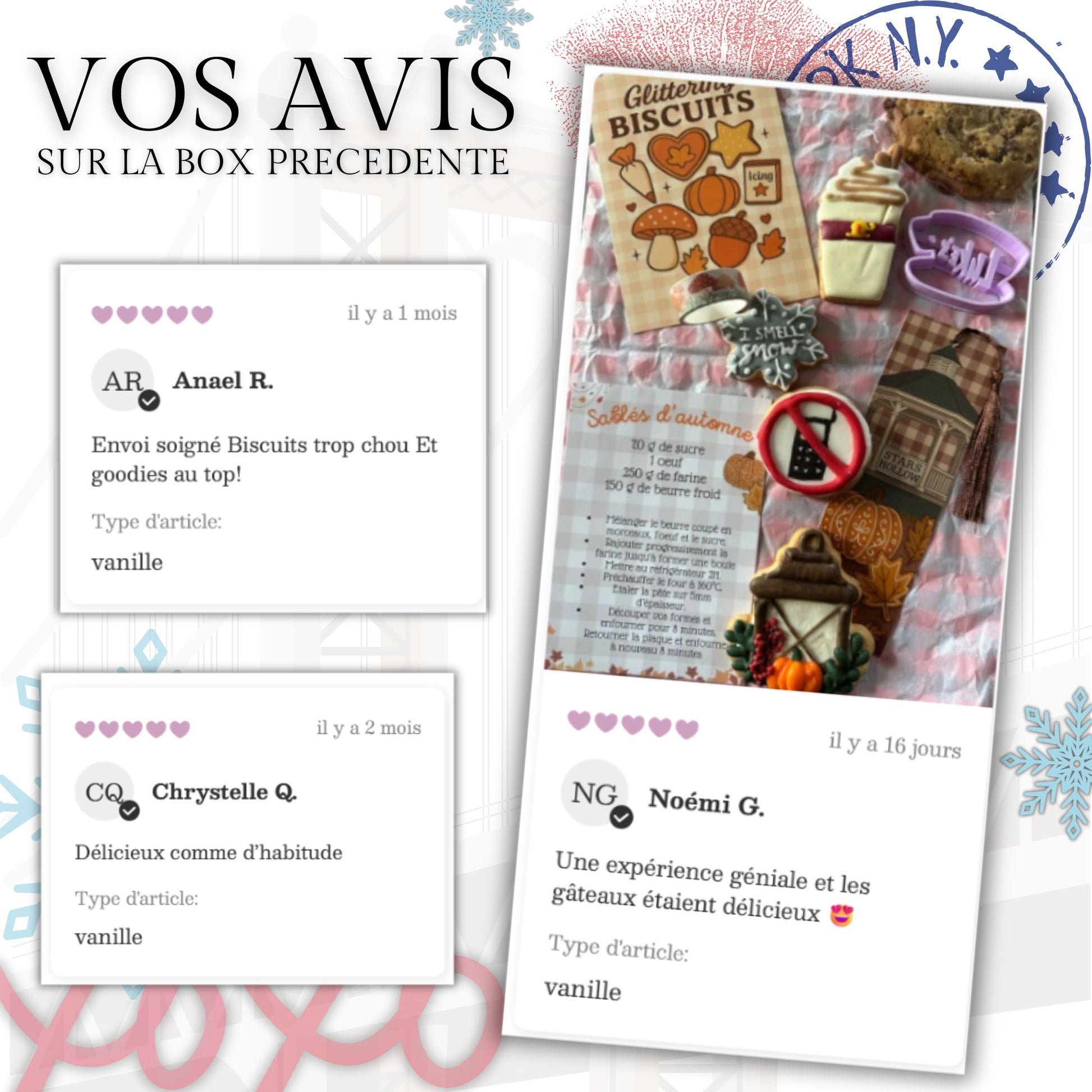 Des gourmandises artisanales (dont 4 biscuits décorés, parfum au choix vanille ou chocolat)